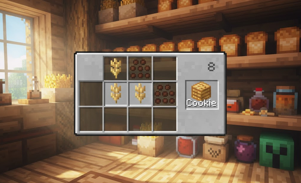 バニラ環境で唯一、明確に「チョコチップ」が入っているお菓子、それが「クッキー」です。チョコレートそのものがアイテムとして存在しないマイクラにおいて、クッキーは実質的なチョコレートアイテムとしての地位を確立しています。クッキーを作るためのレシピは非常にシンプルです。作業台を開き、真ん中の段に左から「小麦」「カカオ豆」「小麦」の順で横一列に並べてください。たったこれだけの材料で、一度のクラフトにつき8枚ものクッキーが出来上がります。このコストパフォーマンスの良さは、食料事情が厳しい序盤のサバイバル生活において意外な助けになることもあります。ただし、クッキーを主食として考える際には注意点があります。クッキーは満腹度の回復量が「2(肉付きマーク1個分)」と非常に少なく、さらに隠しステータスである「隠し満腹度(腹持ちの良さ)」も極めて低く設定されています。そのため、冒険のメイン食料として持っていくと、すぐにお腹が空いてしまい、食べる動作ばかりに時間を取られてしまうことになります。クッキーはあくまで、おしゃれなカフェ建築の装飾として額縁に飾ったり、マルチプレイで友達に「おやつ」として配ったり、あるいはコンポスターに入れて骨粉を作る材料として活用するのが賢い使い方です。また、オウムに与えると即死してしまうという特殊な仕様があるため、ペットを飼っている方は絶対に与えないよう注意が必要です。