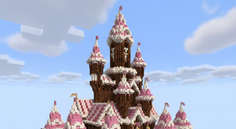 アイテムとしてチョコレートを作るのではなく、建築で巨大なチョコレートを表現するのもマイクラならではの楽しみ方です。「お菓子の家」や「チョコレート工場」をテーマにした建築は、見た目もポップで可愛らしく、マルチプレイでも人気のスポットになります。チョコレート建築をする際に鍵となるのは、ブロックの素材選びです。基本となるのは「茶色のテラコッタ」や「茶色のコンクリート」です。テラコッタは少しマットで乾いた質感があり、ココアパウダーがかかったようなトリュフチョコの表現に向いています。一方、コンクリートは色が均一で濃いため、濃厚なダークチョコレートの表現に最適です。さらに、ミルクチョコレートの色合いを出したい場合は、「皮を剥いだダークオークの原木」や「茶色の羊毛」を混ぜて使うと、質感に深みが出ます。ホワイトチョコなら「滑らかなクォーツブロック」や「雪ブロック」、イチゴチョコなら「ピンク色のテラコッタ」や「サクラの木材」が使えます。これらを組み合わせて、溶けたチョコが垂れているようなデザインを壁に施したり、地面をチョコの川に見立てたりすることで、夢のようなスイーツ建築が完成します。光源として「シーランタン」や「グロウストーン」をケーキのトッピングのように配置するのもテクニックの一つです。また、泥ブロックや泥レンガなども、しっとりとしたチョコレートの質感を出すのに非常に役立ちます。