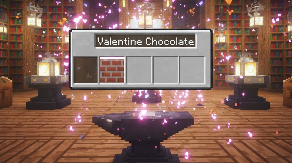 MODを入れるのはハードルが高いけれど、バニラの状態で少しだけ特別なチョコレートアイテムを演出したい。そんな時は「金床(かなどこ)」と「コマンド」の出番です。最も簡単な方法は、金床を使ってアイテムの名前を変更することです。例えば、レンガブロックや茶色の染料、あるいはクッキーを金床にセットし、名前を「特製チョコレート」や「本命チョコ」と書き換えます。これだけで、アイテムを渡した時に相手の画面にはその名前が表示されるため、ごっこ遊びとしては十分に機能します。さらに、Java版でコマンドを使える環境(クリエイティブモードやOP権限がある場合)なら、もっと凝った演出も可能です。giveコマンドを使って、説明文(Lore)付きのアイテムを作り出すことができます。「食べると幸せになる魔法のチョコ」といった説明文をアイテムに追加すれば、プレゼントとしての特別感が一気に増します。また、上級者向けにはなりますが、「カスタムモデルデータ」を使用して、特定のアイテムの見た目だけを板チョコのテクスチャに差し替えるリソースパックを自作または導入することも可能です。これにより、ゲームの仕様を変えることなく、見た目だけを完全にチョコレートにすることができます。サバイバルサーバーでのイベント景品などにも使えるテクニックなので、コマンド生成ツールなどを活用して挑戦してみる価値はあります。