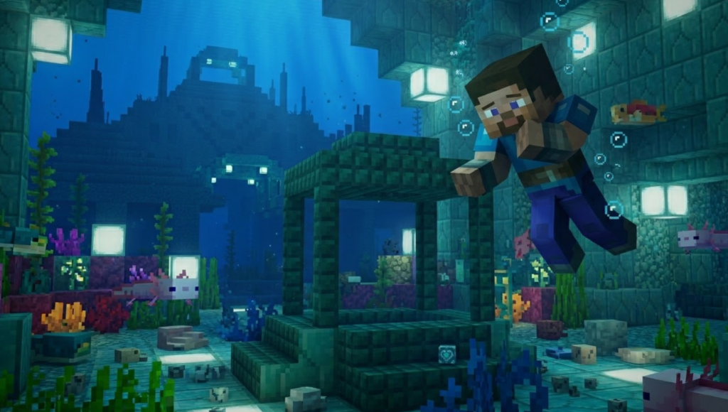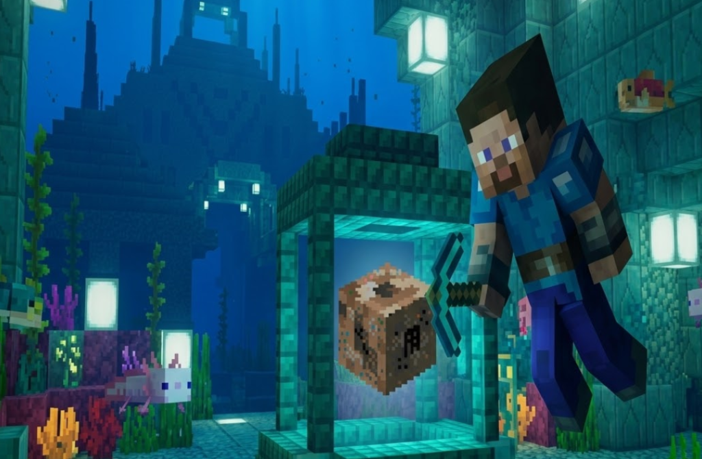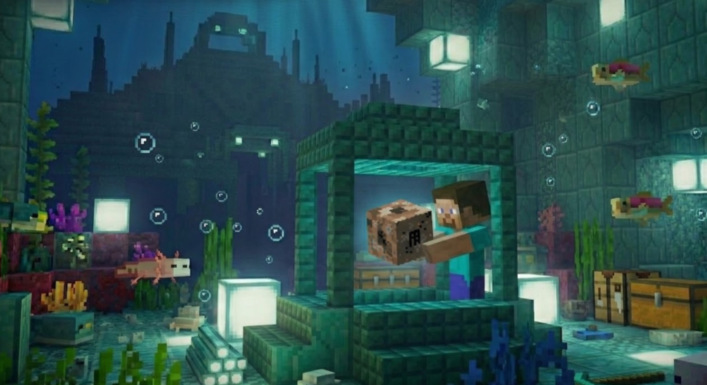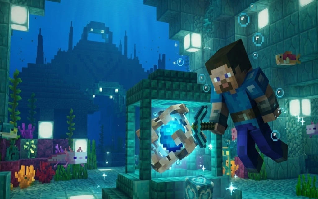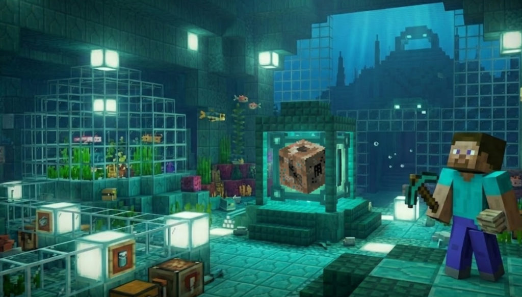 コンジットを安全に使うコツは、最初から「移設できる設備」として考えることです。水中拠点では、建築途中と完成後で便利な位置が変わりやすく、最初に置いた場所が最後まで最適とは限りません。コンジットは壊して回収し、再設置できる装置なので、固定配置にこだわりすぎないほうが使いやすいです。建築中は、掘削や整地の中心に近い場所へ仮設置すると、水中呼吸や視界改善、採掘補助の恩恵を受けやすくなります。さらに、活性化したコンジットは光を放ち、近くの水に触れている敵対Mobへダメージを与えるため、作業中の安全性も高めやすいです。一方で、拠点が完成に近づいたら、見た目や動線を優先して位置を見直したくなることがあります。そのとき、「壊したらもったいない」と思って無理に置きっぱなしにする必要はありません。コンジットは回収して別の位置に移せるため、景観と実用性の両方を取りやすいです。おすすめなのは、攻略用や工事用の仮設置と、完成後の本設置を分けて考えることです。前半は作業効率を重視し、後半は効果範囲や見た目を整える。こう考えるだけで、コンジットは“壊すのが怖い高級品”ではなく、“必要に応じて動かせる便利な装置”になります。水中拠点づくりで失敗しにくくするには、コンジットを固定物としてではなく、状況に合わせて配置を変えられる設備として使うのがいちばん実用的です。