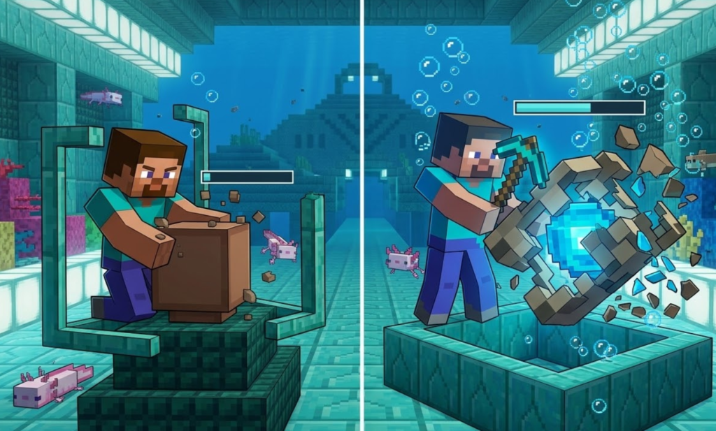 コンジットは素手でも壊せます。これはかなり重要なポイントで、道具を持っていない場面でも理論上は回収できます。ただし、素手で壊せることと、実戦で快適に回収できることは別です。日本語のMinecraft情報では、コンジットの採掘時間は素手で4.5秒、木のツルハシで2.25秒、石で1.15秒、鉄で0.75秒、ダイヤモンドで0.6秒、ネザライトで0.5秒、金で0.4秒と整理されています。つまり、素手でも回収そのものは可能ですが、ツルハシを使うだけで作業時間は大きく短くなります。海中では数秒の差がそのまま安全性に直結しやすいので、海底神殿周辺や水中拠点整備中なら、素手よりツルハシのほうが明らかに実用的です。さらに、コンジットは回収時にシルクタッチを必要としません。ここは誤解されやすい部分ですが、特殊エンチャントなしでそのままアイテムとして落ちるため、回収用に特別な装備を用意する必要はありません。要するに、仕様としては素手でも問題ない、けれど安全かつ確実に回収したいならツルハシが最適、という理解がいちばん実用的です。とくに海中では、視界・酸素・敵対Mobという複数の要素が重なるため、破壊時間を短縮できるだけでも作業難度はかなり変わります。迷ったら、コンジットの回収は“素手でも可、実用面ではツルハシ推奨”で覚えておくと失敗しにくいです。