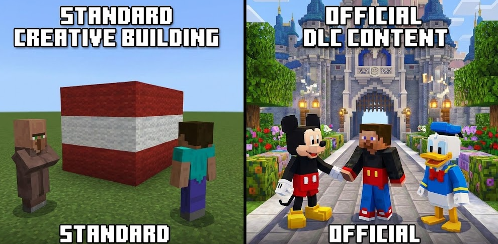 統合版ユーザーにとって最強の選択肢となるのが、Mojang公式の「マーケットプレイス」で販売されているディズニー公式DLCです。ここには、パーク再現に特化した「Walt Disney World Magic Kingdom Adventure」や、映画のストーリーを追体験できる「Disney Worlds of Adventure」などの有料コンテンツが並んでいます。