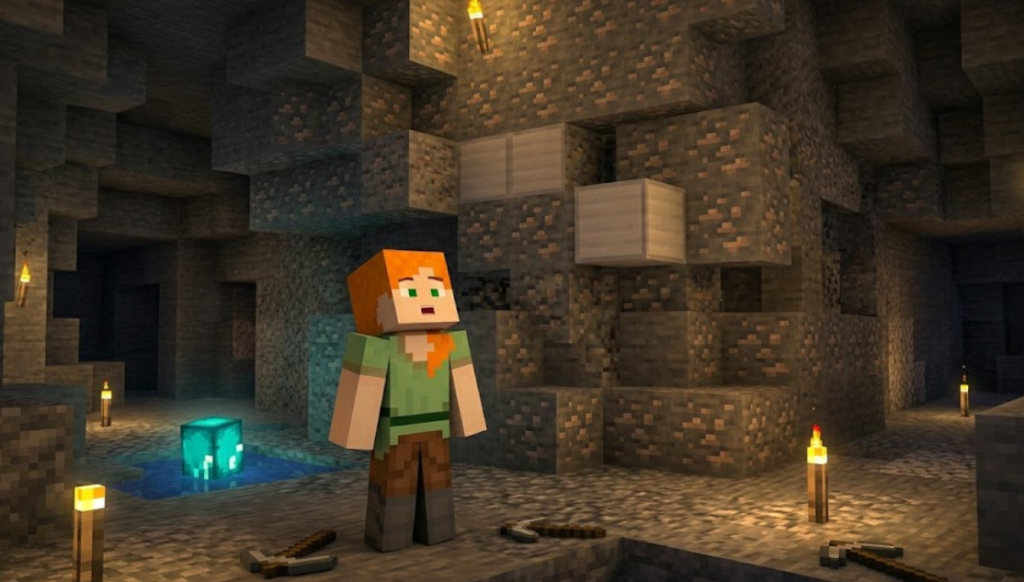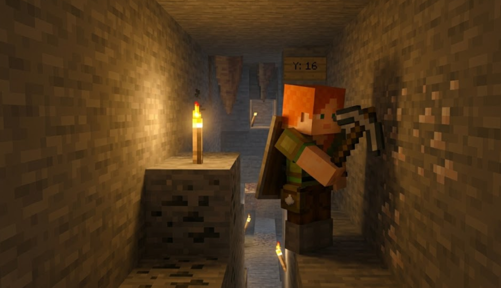 山が近くにないワールドでは、地下採掘がしっかり主力になります。現在の国内情報を見比べると、鉄の地下帯はY10〜20台で語られることが多く、その中心としてY16前後が有力候補として挙げられています。一方で、ブランチマイニングに限ればY10付近をすすめる記事もあるため、ここは「Y16だけが唯一の正解」と考えるより、Y10〜20台を狙い、その中でもY16前後を基準にすると覚えるのが実戦向きです。この高さのよさは、拠点の近くから坑道を伸ばして安定して掘れること。山岳探索のように遠征しなくてもよく、食料と松明、予備ツルハシさえあれば継続しやすいのが強みです。また、洞窟に接続すれば露出鉄も拾いやすく、ブランチマイニングだけでなく自然洞窟の壁面回収も絡められます。安全重視なら細い坑道で、効率重視なら空洞探索を混ぜるなど、プレイスタイルに合わせて調整しやすいのも地下採掘の魅力です。山岳帯の爆発力には一歩譲る場面があっても、毎回同じ感覚で鉄を積み上げやすい安定感は非常に大きいです。近場で堅実に増やしたい人には、今でも十分に頼れる選択肢です。
