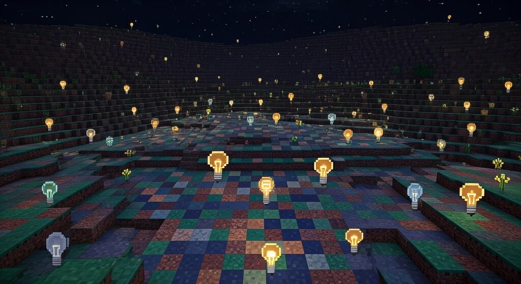 例えば、荘厳な大聖堂の床、薄暗い雰囲気を演出したい古城の通路、あるいは自然の景観をそのまま生かしたい森の中の小道など、これまでなら松明やランタンを置くしかなかった場所に、見えないライトブロックを埋め込むだけで、見た目を全く変えずに完璧な湧き潰しが完了します。これにより、プレイヤーは初めて、建築デザイン(見た目)と、湧き潰しというゲームシステム(機能)を完全に分離して考えることができるようになりました。もはや照明のためにデザインを妥協する必要はなく、理想の建築を追求しながら、安全な空間を創り出すことが可能になるのです。