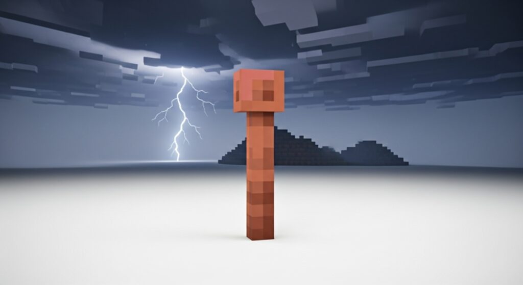 避雷針は、バージョン1.17の「Caves & Cliffs」アップデートで追加されたアイテムです。このアップデートの目玉となった新資源が「銅」でした。開発者は、プレイヤーに銅を採掘し、活用してもらうための動機付けとして、この避雷針を設計したのです。つまり、避雷針は単なる便利アイテムではなく、長年のプレイヤーを悩ませてきた「落雷による火災」という問題を解決するための、銅という新資源の象徴的な使い道として導入されたのです。