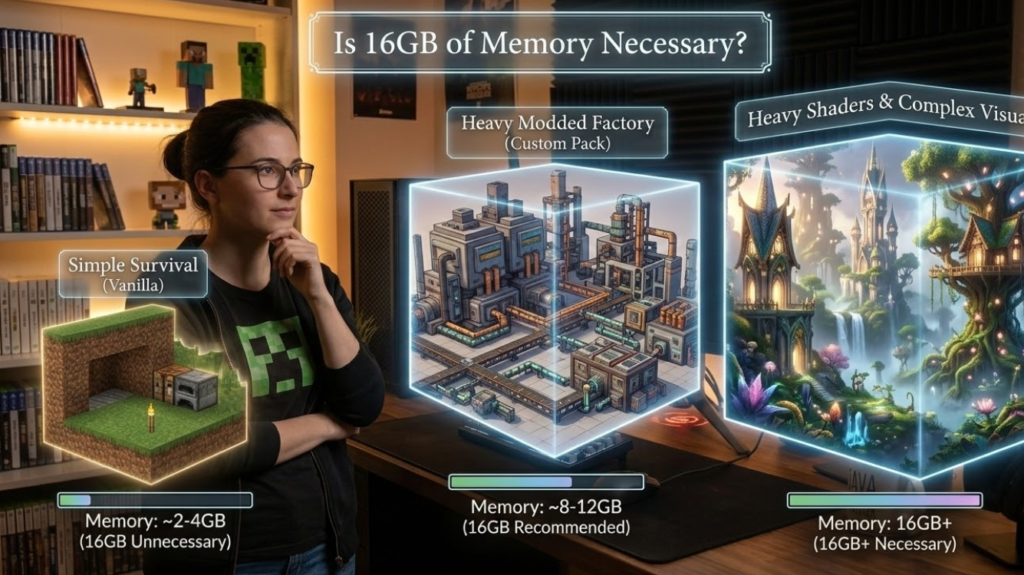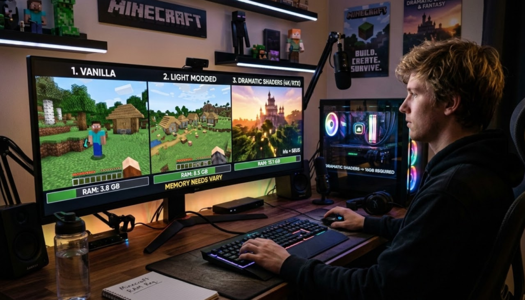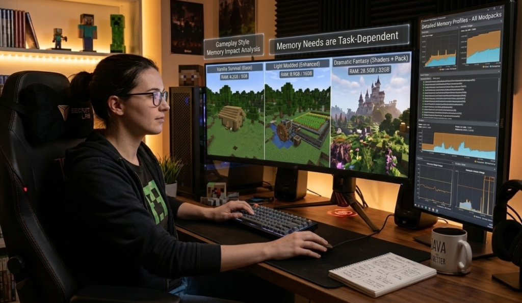 メモリ割り当ての目安は、プレイスタイルごとに考えると整理しやすくなります。バニラ中心なら、比較的少なめの割り当てでも動きやすく、便利系MODを少し追加した程度でも、すぐに大容量が必要になるとは限りません。一方で、大規模MODパック、独自ディメンションの追加、工業系や魔術系の多機能MOD、高解像度リソースパック、重いシェーダーを組み合わせる構成では、必要な余裕が大きくなることがあります。ここで大事なのは、必要量が単純にMODの数だけで決まるわけではないことです。同じ20個でも、軽い補助系が中心なのか、ワールド生成やシステム追加の多い大型MODが中心なのかで負荷はまったく変わります。さらに、シェーダーはRAMだけでなくGPU性能の影響が非常に大きいため、シェーダー使用中に重いからといって、即座に16GBへ上げるのが最適とは限りません。影の品質、描画距離、解像度、反射表現などを調整した方が、体感改善につながることもあります。つまり、16GBは「重い構成なら候補になる」のであって、「MODやシェーダーを入れたら必須」という値ではありません。判断するときは、起動時に不安定か、プレイ中に足りないのか、描画だけが重いのかを切り分けると失敗しにくくなります。快適さは数値の大きさだけで決まるものではなく、自分の構成とPCのバランスに合っているかどうかで決まります。少し余裕のある値を狙い、段階的に調整していく姿勢が最も安全です。
