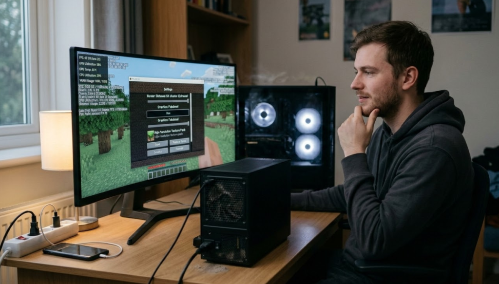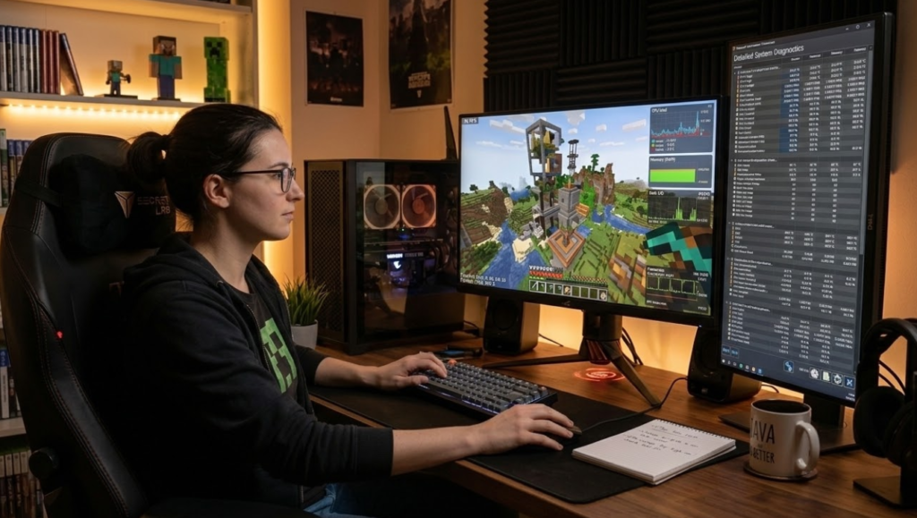 16GBを割り当てる前に、最初に見るべきなのはPC全体の搭載メモリです。たとえば、PCに16GBしか載っていないのに、そのすべてをマイクラに回す考え方は現実的ではありません。OSそのものに加えて、Minecraft Launcher、ブラウザ、通話アプリ、録画ソフト、音楽再生ソフトなども同時にメモリを使うため、ゲームへ大きく割り当てすぎると全体の動作が不安定になることがあります。次に確認したいのがCPU性能です。マイクラはメモリだけで軽くなるゲームではなく、チャンク生成、村人やMOBの密集、大型装置の処理、演算距離の高さなどではCPU負荷が大きくなりやすいです。さらに、シェーダーや高解像度のテクスチャを使っている場合はGPU側の負荷も強くなります。そのため、RAMだけを増やしても期待ほどFPSが伸びないことがあります。確認の順番としては、搭載メモリ量、CPU性能、GPU性能、Java版か統合版か、MODやシェーダーの有無、描画距離の設定を整理すると判断しやすくなります。とくに「メモリは多いのに重い」というときは、実際には描画設定やCPU側のボトルネックが原因ということも少なくありません。16GBという大きな値は、PC全体に十分な余裕があり、なおかつ今の遊び方が重い構成に当てはまる場合にだけ検討する、という考え方が安全です。