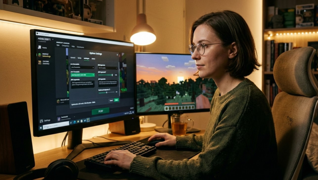 メモリ割り当てを直接調整しやすいのは、主にJava版です。考え方としては、Minecraft Launcherの起動構成や詳細設定からJVM引数を確認し、その中の最大メモリ指定を見直します。よく使われるのが -Xmx という指定で、ここにゲームへ使わせる最大メモリ量を設定します。たとえば16GBを上限にしたい場合は -Xmx16G のような形になり、すでに -Xmx4G-Xmx8G になっているなら、その数値だけを変更するイメージです。ただし、JVM引数にはメモリ以外の設定も含まれることがあるため、意味の分からない項目まで不用意に書き換えない方が安全です。実際の作業では、まず現在の値をメモしておき、変更するのは -Xmx の部分だけにとどめるのが無難です。設定後は、その場で結論を出さず、起動時間、ワールド参加時の読み込み、ディメンション移動の滑らかさ、長時間プレイ後の安定性などを実際に確認してください。また、4GBから8GB、8GBから12GB、必要なら16GBというように段階的に上げると、どこで改善したかを把握しやすくなります。最初から極端に大きな値へ変更すると、効果があったのか、別の要因で重いのかが分かりにくくなります。設定そのものは難しくありませんが、本当に大切なのは「大きくすること」ではなく、「自分の構成にとって必要十分な値で止めること」です。比較しながら調整すると失敗しにくくなります。