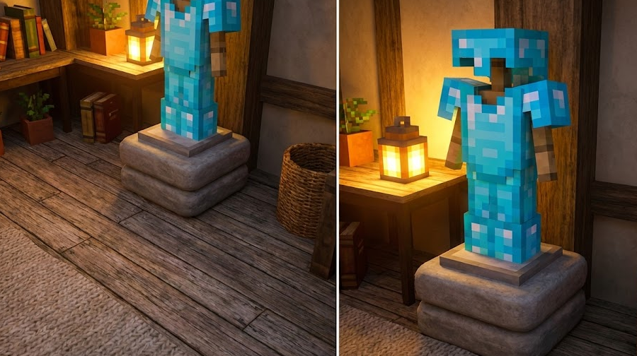 防具立てのレシピは、棒を6本と、滑らかな石のハーフブロックを1つ使用します。お気に入りのダイヤモンド装備やネザライト装備を飾ったり、予備の防具を整理しておいたりするのに非常に便利です。また、レッドストーン回路と組み合わせて動く装飾を作ったり、建築のディテールとして活用したりと、上級者の間では多様な使い方が考案されています。