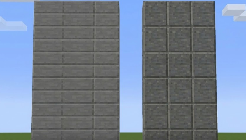 このハーフブロックの最大の特徴は、二つ重ねてフルブロックの状態にしたときの見た目です。通常の滑らかな石のブロックとは異なり、ハーフブロックを重ねたものは四方の枠線がなくなり、非常にすっきりとした側面になります。