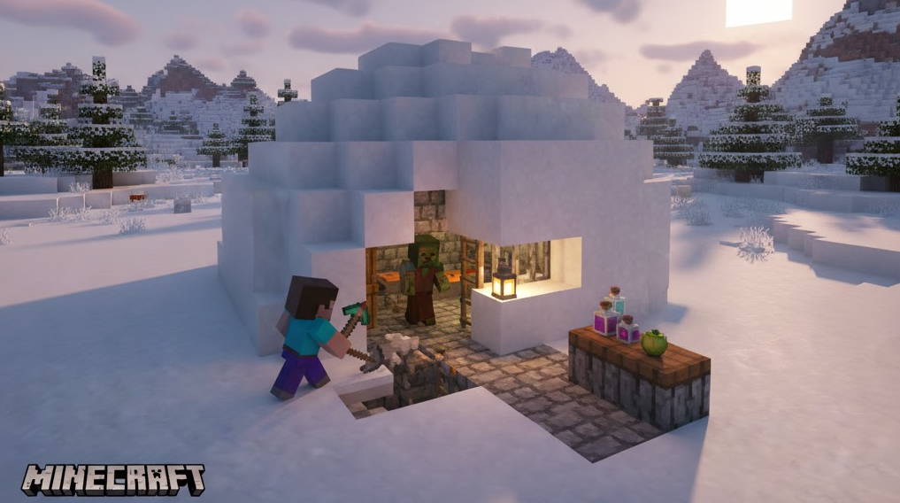 - イグルーの地下室には村人、ゾンビ村人、そして治療アイテム一式が揃っている