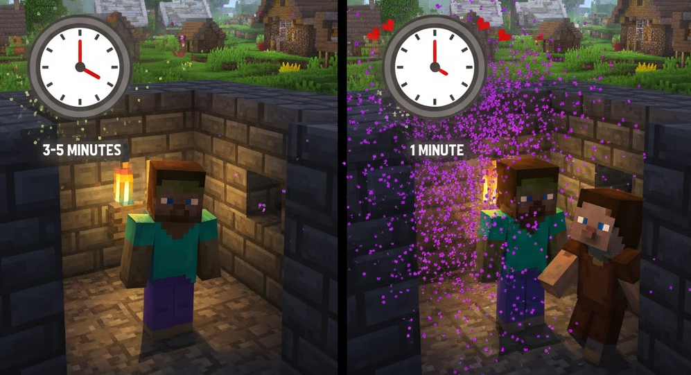 ゾンビ村人に金のリンゴを与え、治療プロセスが開始されると、プレイヤーは完了まで待つことになります。しかし、この「待ち時間」は、あなたがプレイしているマインクラフトのエディションによって大きく異なるため、注意が必要です。