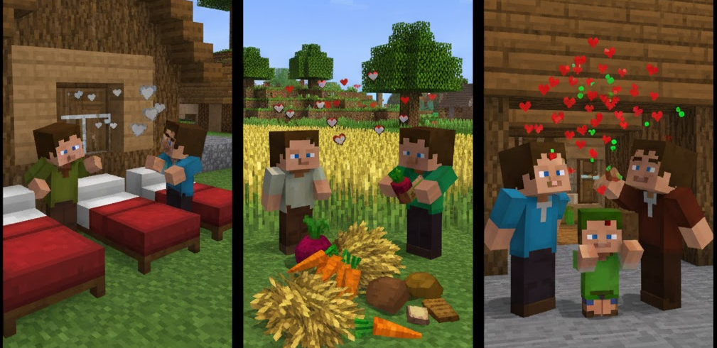 プレイヤーは、これらの食料を村人に向かって投げ与えることで、彼らのインベントリに直接補充することができます。2人の村人がそれぞれ十分な食料を持つと、お互いに近寄ってハートマークを出し、繁殖が行われます。