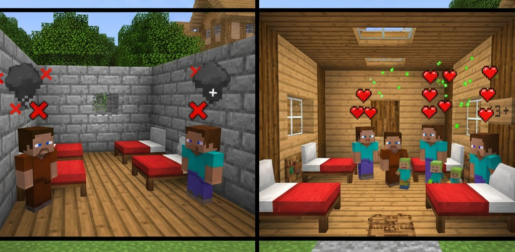 この違いにより、Java版の設計(ベッドを隔離するタイプ)を統合版で建てても、ベッドが村の範囲内にある限り、そのベッドの数までしか村人は増えません。逆に、統合版のシンプルな設計(ベッドと村人を同じ空間に置くタイプ)をJava版で実行すると、生まれた子供がベッドを占有してしまい、すぐに繁殖が止まってしまいます。