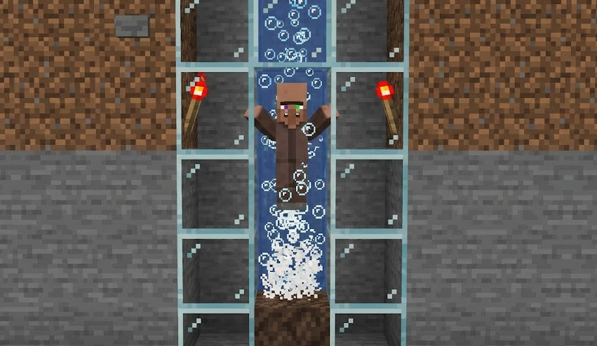 そこで活躍するのが「水流エレベーター(ソウルサンド式)」です。一番下にソウルサンドを設置し、その上に水源を積み上げていくと、泡が発生して上昇水流が生まれます。この水流に村人を巻き込むことで、一瞬にして高所まで持ち上げることができます。ただし、村人が窒息しないように、到着地点には空気を吸えるスペースと、水流から出るための横穴を確保しておく必要があります。