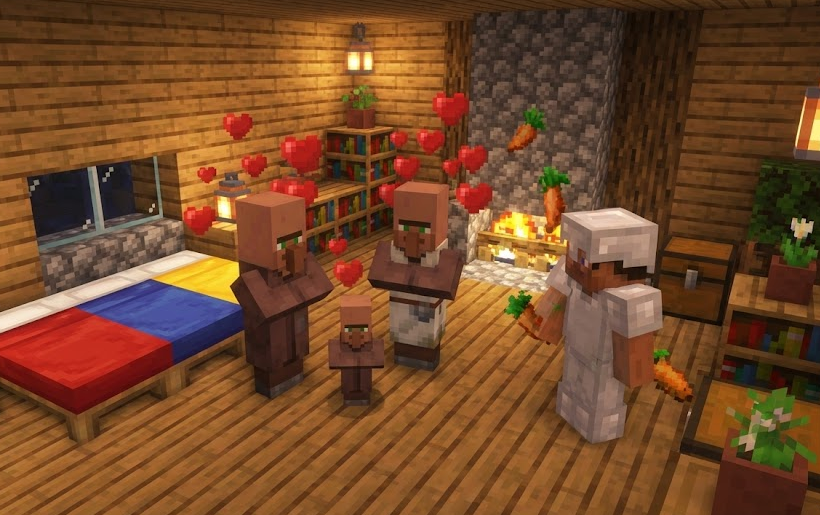 マインクラフトでは、条件さえ整えば村人を無限に繁殖させることができます。必要な条件は、「2人の大人の村人」「十分な数のベッド(増やしたい人数分以上)」「村人への食料の供給」の3つだけです。まず苦労して2人の村人を拠点に運び込みます。そして彼らを安全な部屋に閉じ込め、ベッドを3つ以上設置します(親2人+子供用)。その後、パンやニンジン、ジャガイモなどの食料を村人に大量に投げ渡します。