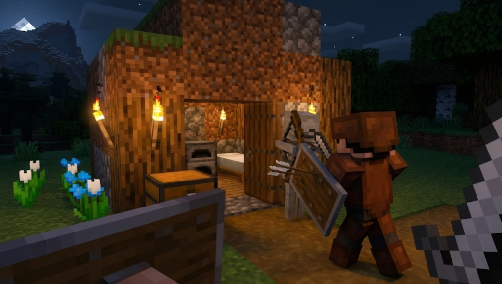 1つ目は、夜や洞窟でスケルトンを倒して骨を集めるルート。骨は骨粉にしてから白の染料にでき、骨1本→骨粉3個という伸びがあるので、少し意識するだけで白素材の在庫が増えていきます。拠点防衛や鉄集めのついでに骨が貯まるため、序盤でも無理がありません。